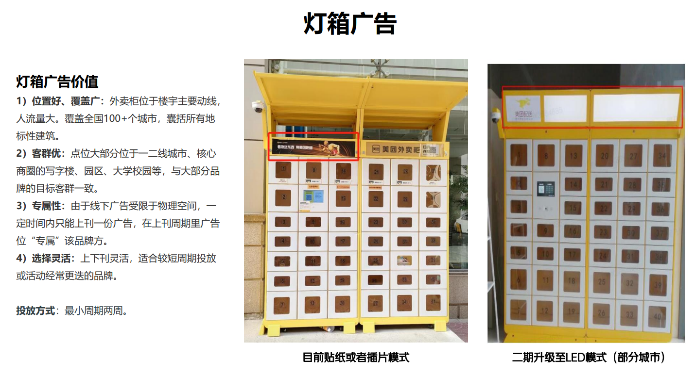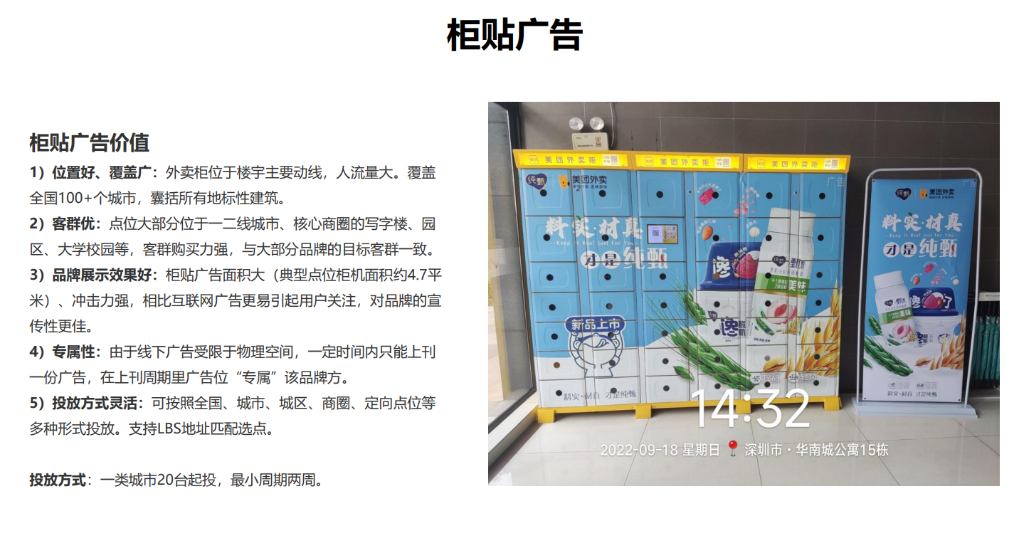 智能外賣柜業務是美團針對大型寫字樓、辦公區等特殊場景推出的全新餐品配送一站式解決方案。是一種可提高騎手交付效率,增強無接觸配送安全性、減少物業管理負擔的新配送交付模式。