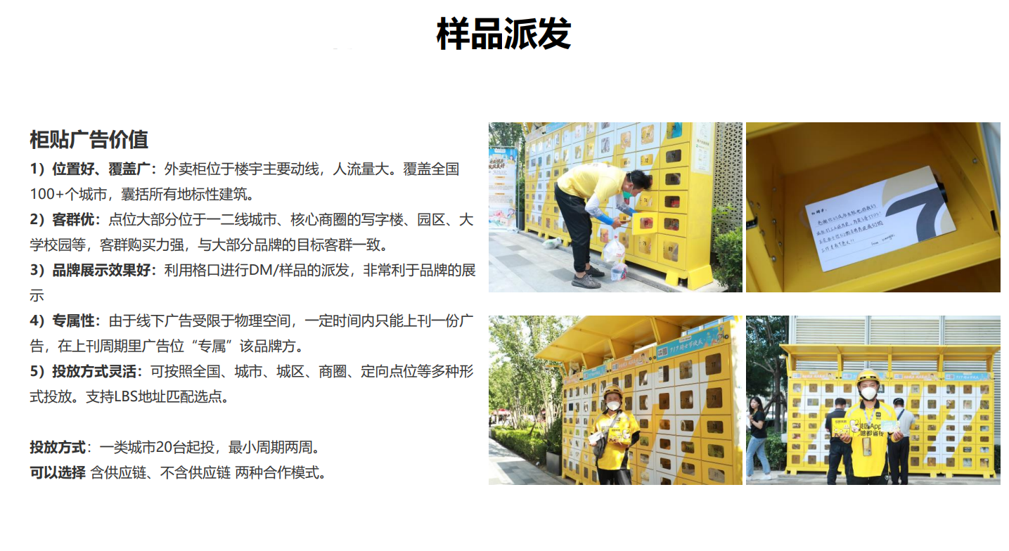 覆蓋面積:目前外賣柜覆蓋點位 10000+,覆蓋城市 100+。包括不限于寫字樓、高校、小區、酒店、醫院。并且一線城市及新一線城市為 主要人群,占比73%,中高活躍度用戶占比60% ;